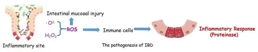 IBD是一种非特异性慢性炎症性疾病,主要包括Crohn’s disease(CD)和 ulcerative colitis(UC),是由长期未能得到及时控制的肠道黏膜炎症引起的。许多研究指出,活性氧(ROS)在IBD的进展中起着重要作用,IBD发生时生成大量ROS,而过量的ROS会进一步激活炎症反应。 此外,一些蛋白酶如弹性蛋白酶和蛋白酶-3在引发和维持炎症反应中发挥重要作用。