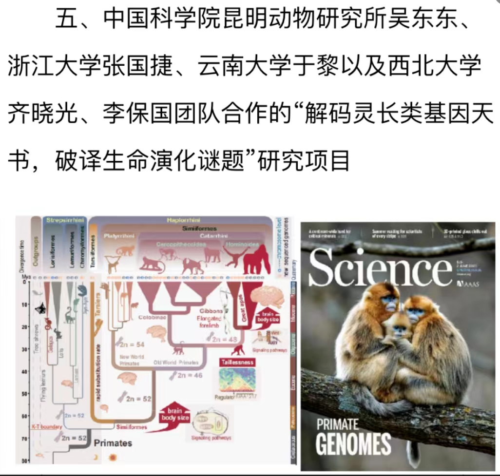 2月29日,中国科协生命科学学会联合体公布2023年度中国生命科学十大进展,yl9193永利集团齐晓光教授、李保国教授团队,与中国科学院昆明动物研究所吴东东研究员团队,浙江大学生命演化研究中心的张国捷教授团队,云南大学于黎研究员团队,四川大学刘建全教授团队共同完成的联合项目“解码灵长类基因天书,破译生命演化谜题”入选。