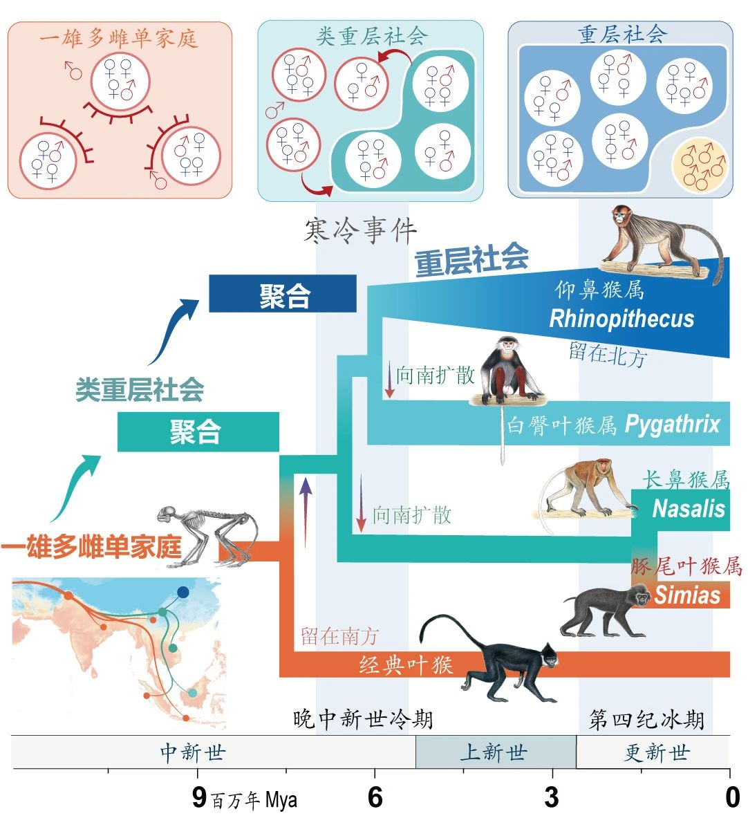 永利集团齐晓光教授团队联合国内外多家科研单位,通过整合生态学、地质学、行为学、进化基因组学等多学科,通过系统发育分析和社会系统的祖先状态重建,发现亚洲叶猴中奇鼻猴类群的社会系统演化经历了两步式的聚合过程,且两次聚合都与冰期时期相关。在此过程中,与寒冷适应和神经激素相关的基因在奇鼻猴类群中发声变化,这些基因在社会联系中起着关键作用。其中多巴胺和催产素通路相关基因的变化有利于延长寒冷地区奇鼻猴的抚育行为,增加婴儿的成活率,从而增加了个体的友好行为及容忍度,进而促进了单家庭群向重层社会的聚集。