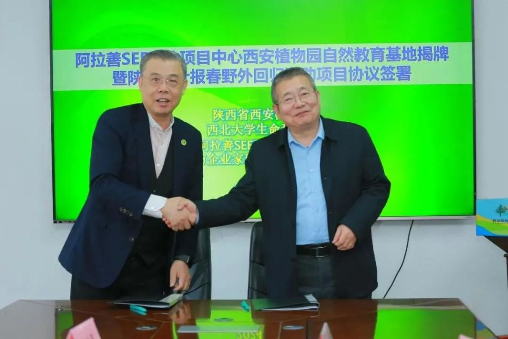 随后,西安市企业家环保基金会理事长王辉和西安植物园主任岳明签署“陕西羽叶报春野外回归项目”资助协议,阿拉善SEE西北项目中心邹斌主席、西安市植物园岳明主任教授、yl9193永利集团党委副书记魏宁共同为自然教育基地揭牌。