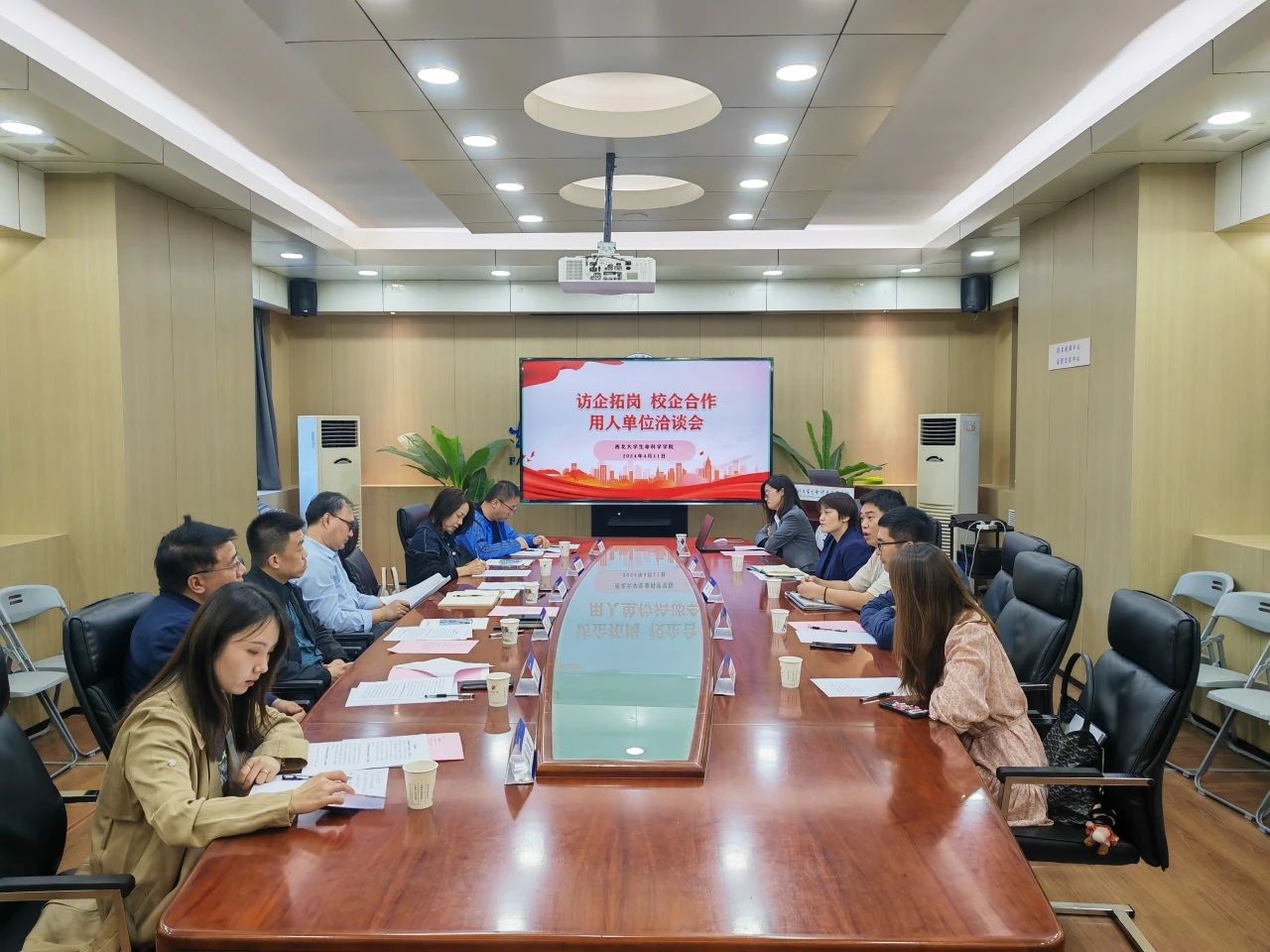 为进一步推进访企拓岗专项行动,切实做好2024届毕业生就业服务工作,帮助毕业生拓宽就业渠道,以2024届毕业生生命科学类春季专场招聘会为契机,4月11日上午,我院于博睿会议室举办访企拓岗 校企合作——用人单位洽谈会。学院张宇书记、付爱根院长、魏宁副书记、张亚妮副院长、樊涛副院长、郭佳惠老师参会,广东菲鹏生物有限公司校招&校企合作负责人曲丽桓、陕西麦可罗生物科技有限公司人力资源部高级经理马继朋、上海天昊生物科技有限公司销售部北方大区经理胡抗、上药科园信海陕西医药有限公司人力资源经理赵琦、正大天晴药业集团生产hrbp经理车晓霞参加座谈。洽谈会由张宇书记主持。