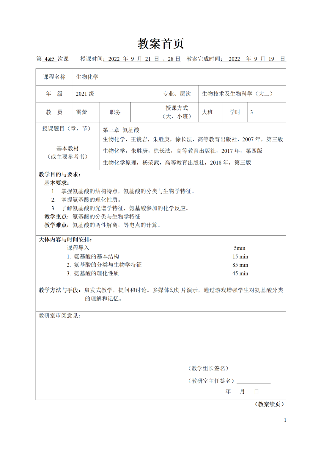 《生物化学》课程组,主要承担生命科学院、药学院和医学部的《生物化学》以及《生物化学实验课》的教学工作。团队成员12人,包括教授5人,副教授6人,讲师1人。生命科学院的《生物化学》课程内容按照知识体系可分为结构生物化学(上册)和代谢生物化学(下册)两大模块。《生物化学(上)》由雷蕾,马乐及薛姣为主讲老师。