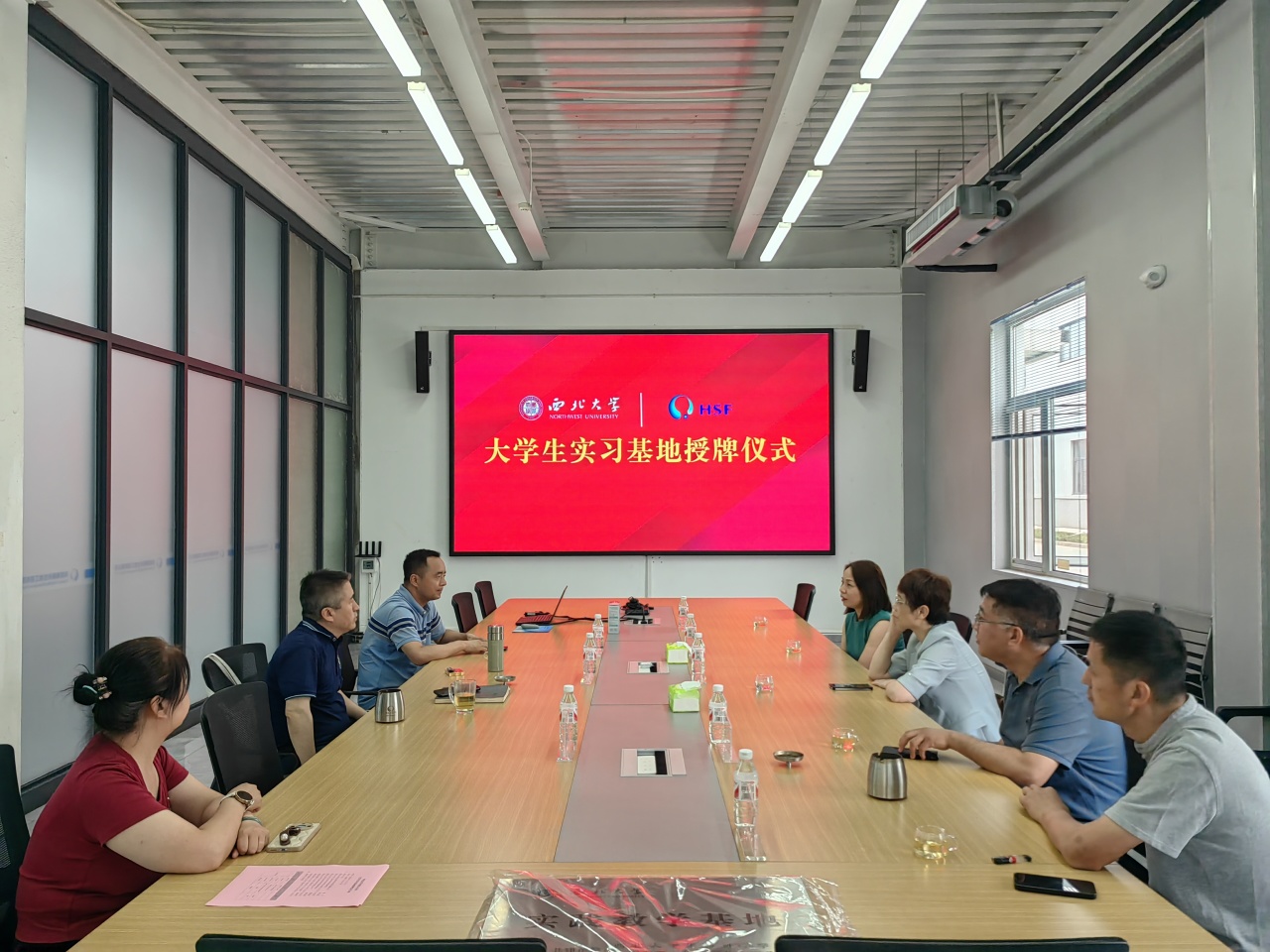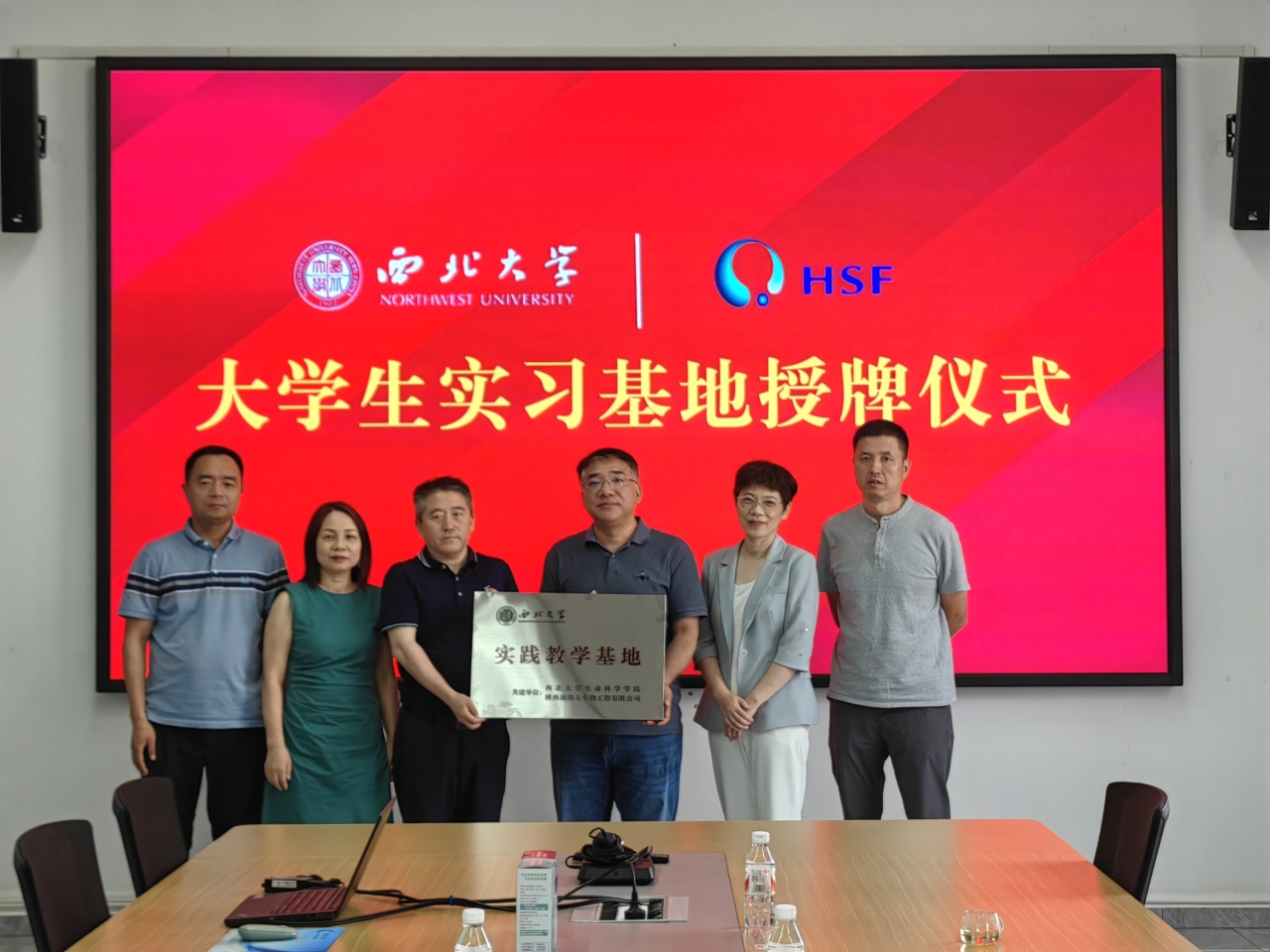 张亚妮介绍了学院专业分布、本科培养方案、教学实践模式等,期待双方拓展出更多合作模式,促进学生培养与社会需求积极接轨;魏宁介绍了学院2024届毕业生基本情况、就业进展与当前工作重点,表示将尽全力为用人单位搭建与毕业生高效双选平台,希望能拓展更多针对性岗位,助力毕业生更顺利就业;朱宏莉、雷重涤重点分享了本科生实践实习现状与合作需求;与会成员围绕教学实践、生产实习、人才输送、课程开发、互派交流等进行了充分交流。最后,双方共同举行大学生实习基地授牌仪式,魏宁代表学院为“yl9193永利集团 陕西海斯夫生物工程有限公司 实践教学基地”授牌,双方互赠纪念品并合影留念。