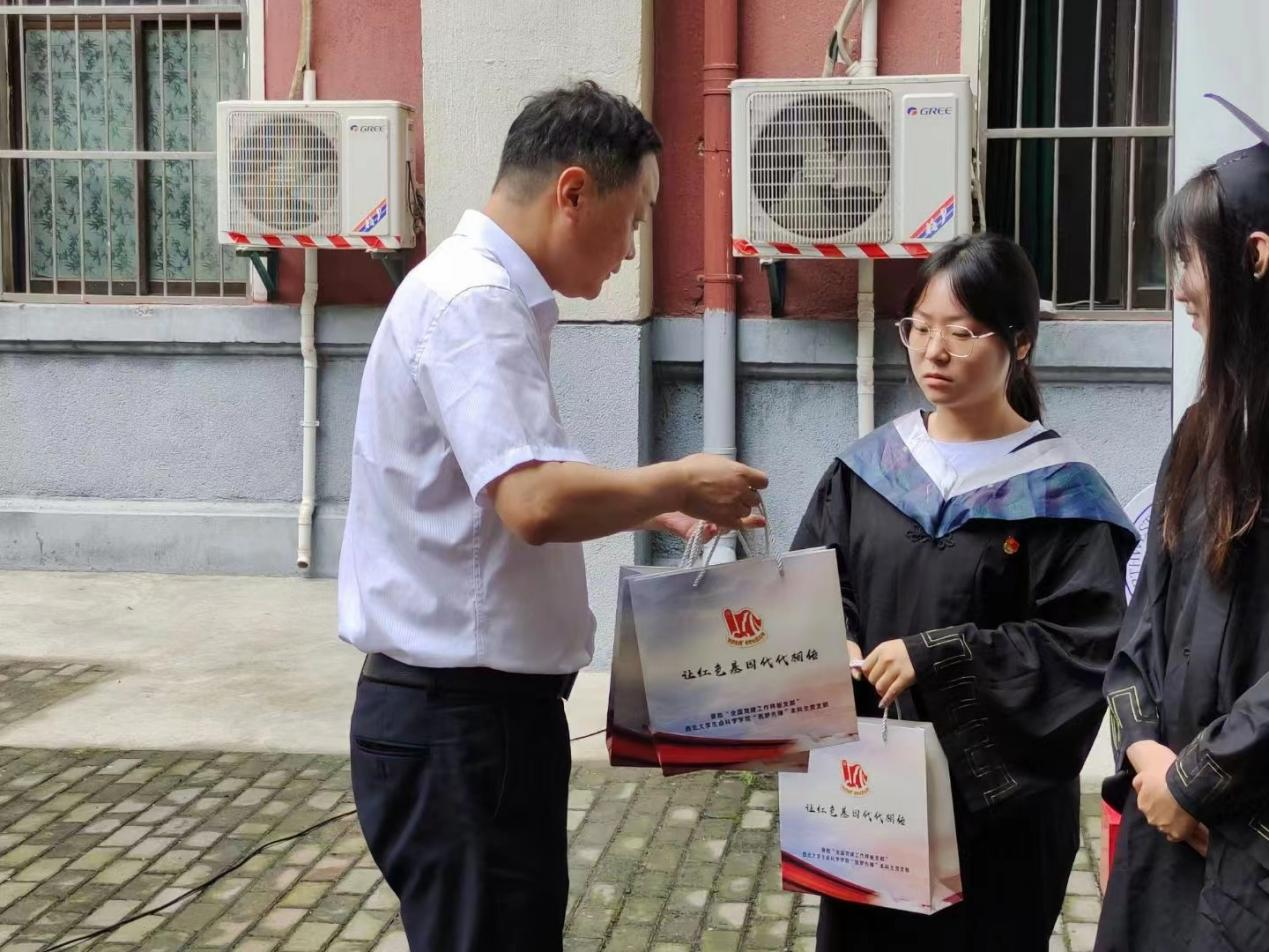 陈富林副校长等为同学们发放毕业纪念品,此次毕业纪念品由“筑梦先锋”本科生党支部低年级党员精心设计准备,包括支部徽章、定制明信片、定制笔记本以及《中国共产党章程》,希望毕业生党员努力成长为有理想、敢担当、能吃苦、肯奋斗的新时代好青年。