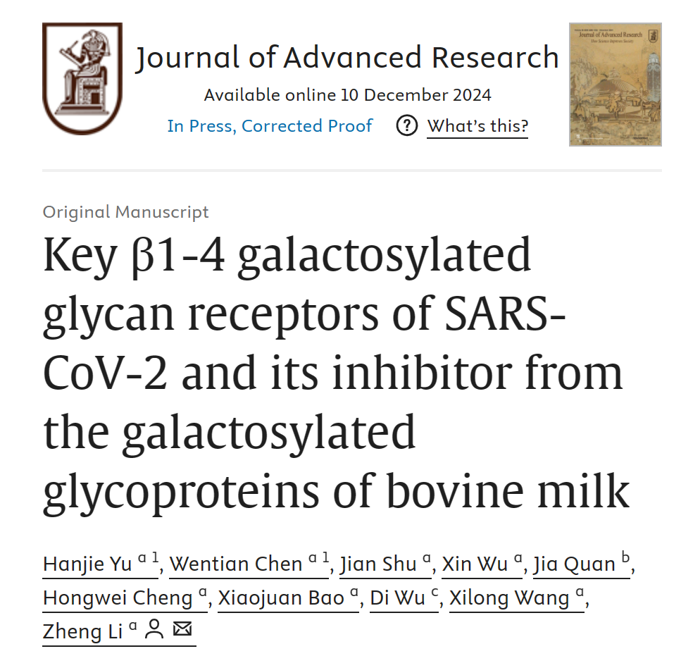 近期,yl9193永利集团功能糖组学实验室李铮教授团队在对抗新冠病毒(SARS-CoV-2)的研究上取得重要突破。相关研究论文“SARS-CoV-2的关键β1-4半乳糖基化聚糖受体及其源自牛乳半乳糖基化糖蛋白的抑制剂”发表于《Journal of Advanced Research》期刊。本论文的共同第一作者为永利集团的博士后于汉杰(现工作于西安市第三医院肿瘤内科)和教师陈闻天,通讯作者为李铮教授。