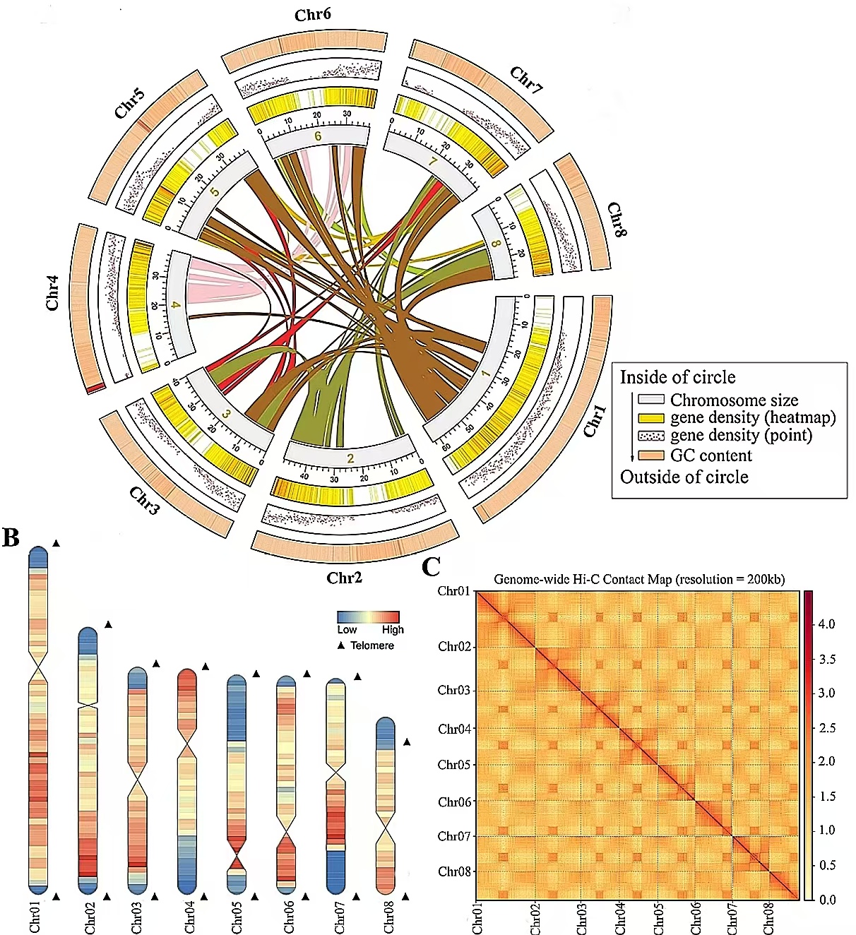 本研究以全球广泛种植的欧洲甜樱桃品种“美早”为研究对象,利用PacBio HiFi、ONT Ultra-long和Hi-C测序技术,完成了欧洲甜樱桃的T2T无间隙基因组组装。研究团队生成了75.40 Gb(109×覆盖度)的HiFi数据、26.70 Gb(79.6×覆盖度)的ONT Ultra-long数据以及161.20 Gb的Hi-C测序数据。经过初步组装和优化,最终获得了大小为342.23 Mb的T2T无间隙基因组,包含8条假染色体,contig N50达到40.66 Mb,基因组完整性评估(BUSCO)达到99.36%。基因组注释结果显示,重复序列占基因组的61.74%,其中简单重复序列(SSR)占0.42%,串联重复序列占67.30%。通过结合转录组预测、从头预测和同源性预测,研究团队共注释了36,150个基因,其中包括31,562个蛋白质编码基因和4588个非编码RNA基因(如rRNA、tRNA和miRNA)。
